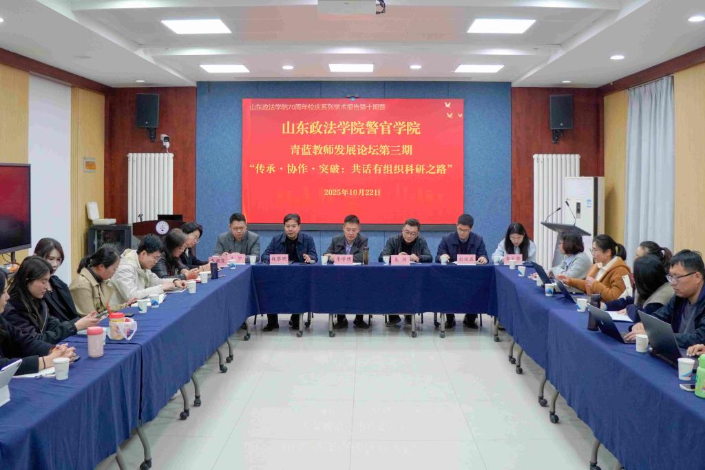 10月22日,警官学院在司法鉴定中心一楼会议室召开山东政法学院70周年校庆学术报告第十期暨山东政法学院警官学院第三期青蓝教师发展论坛。山东政法学院科研处处长李学博受邀参加活动并担任主讲嘉宾,警官学院副院长彭俊磊、教学科研秘书王宁、经济贸易法学院博士李文静作为与谈人交流,网络空间安全学院副院长吴剑作为特邀嘉宾带队参加。本次论坛由警官学院院长魏黎明主持。