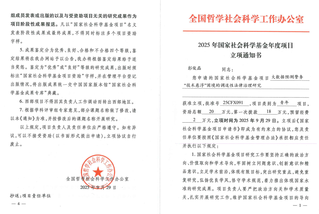 2.警官学院连续两年获批国家社科基金项目。2025年9月,学院副院长彭俊磊副教授主持的《大数据预测警务“技术悬浮”困境的调适性法律治理研究》成功获批国家社科基金青年项目。这是继2024年王宁副教授获批国家社科基金项目后,学院再次斩获此项国家级科研立项,标志着学院在科研创新能力、高水平学术研究领域持续突破,科研实力与学科建设水平稳步提升。