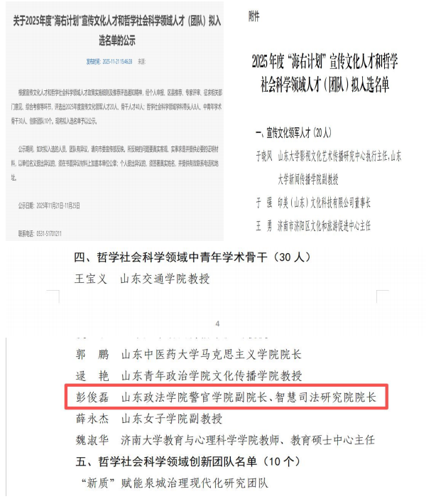 9.警官学院教师获多层次人才称号,师资队伍建设质量不断提升。2025年,学院副院长彭俊磊副教授斩获多项市级人才荣誉,获评济南市2025年度“海右计划”宣传文化人才、哲学社会科学领域“哲学社会科学领域中青年学术骨干”称号,同时荣获济南市“法治人才”称号、山东省哲学社会科学优秀成果二等奖等。2025年12月,学院王宁副教授获评学校“鼎山领航人才”称号,赵福刚副教授获评学校“鼎山扬帆人才”称号。这既是对教师个人学术能力与工作成效的高度认可,也是学院师资队伍建设质量稳步提升、人才培育工作成效显著的生动体现。