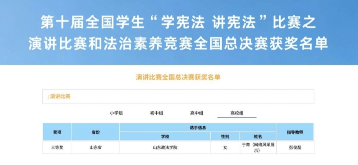 10.警官学院学生获第十届全国学生“学宪法 讲宪法”全国总决赛三等奖,学科竞赛取得新突破。2025年12月,由教育部主办的第十届全国学生“学宪法 讲宪法”活动全国总决赛在北京圆满落幕。警官学院于菁同学在全国众多参赛选手脱颖而出,荣获高校组演讲比赛三等奖,彰显了学院学子扎实的专业素养和良好的综合能力。2025年以来,警官学院多措并举强化学生学科竞赛,全年共斩获大学生新文科实践创新大赛等省级以上奖项100余项,实现了学生学科竞赛水平和成果数量的双重突破,进一步丰富了人才培养内涵。