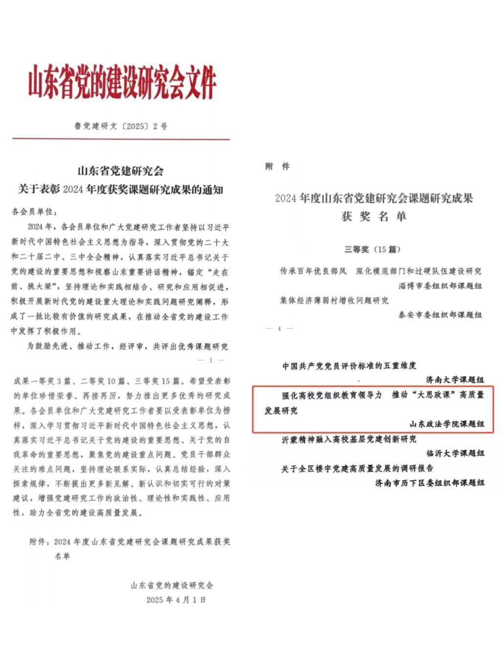8.警官学院党建研究成果获山东省党建研究会表彰。2025年4月,山东省党建研究会对2024年度优秀党建课题研究成果予以表彰。警官学院王宁副教授带领课题组开展的《强化高校党组织教育领导力,推动“大思政课”高质量发展研究》成果荣获三等奖。此次党建研究成果获省级表彰,是学院党委深入推进“一融双高”建设,强化党建引领作用,推动党建工作与“大思政课”建设深度融合、一体推进的有力见证,彰显了学院在党建研究领域的扎实成效和鲜明特色。