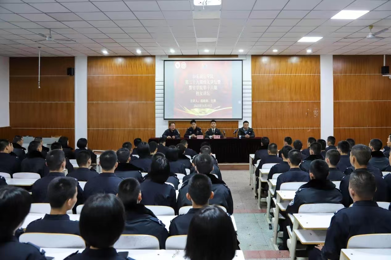10月19日晚,山东政法学院第二十九期校友讲坛暨警官学院第十六期校友讲坛在笃行楼502教室顺利举办。活动邀请到警官学院原十六中一区队长、现山东省青岛市北墅监狱人民警察胡晓雨,原十六中四团支部书记、现济南市章丘区双山街道双山村党总支书记助理任骋两位校友来到现场,分享成长经历与职业心得。警官学院2023级监狱学专业辅导员卢青波及200余名学生参与讲坛。本次讲坛由警官学院2025级监狱学、司法警察学专业辅导员杨志伟主持。